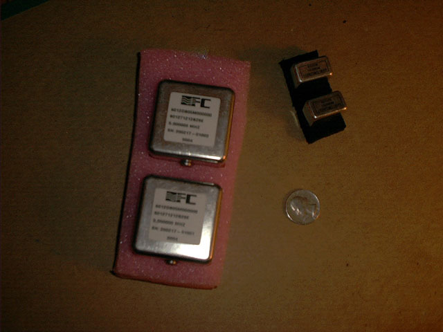 Much design work goes into the oscillators needed to generate a superluminal signal. While clock signals in other parts of the circuit may be cheap, computer grade square waves, this is not the case with the waveform needed within the DMC. The required signal generation must be high precision, low noise. Here are two examples. They both generate precision sine waves, but the smaller units have a noise figure of -65DbC @1 Hz and were not successful in creating a stable waveform. Noise prevented a stable P2 waveform from being generated. The larger double oven units were designed specifically to overcome the problem of close in phase noise. These units provided a minimum noise figure of -107DbC @ 1 Hz, and were successful in generating the proper environmental conditions necessary for making a useful P2 wave within the decision making circuitry (DMC). Presently, this is the largest problem to be overcome before superluminal communication can be considered a commodity industry. First, as you can see by looking at the U.S. Quarter, these oscillators are huge. The rest of the circuitry can, and has been in subsequent prototype generations, shrunk considerably in size through the use of micro power CMOS and SMT components. But, these oscillators must be physically large to work properly and they make for a bulky, power hungry design (each oscillator consumes 0.5 amp @ 12 Volts). Also, being rated for use in spacecraft, you will need to sell your family car to get them... and don't forget you need two. A matched pair - one for the transmitter and one for the receiver.