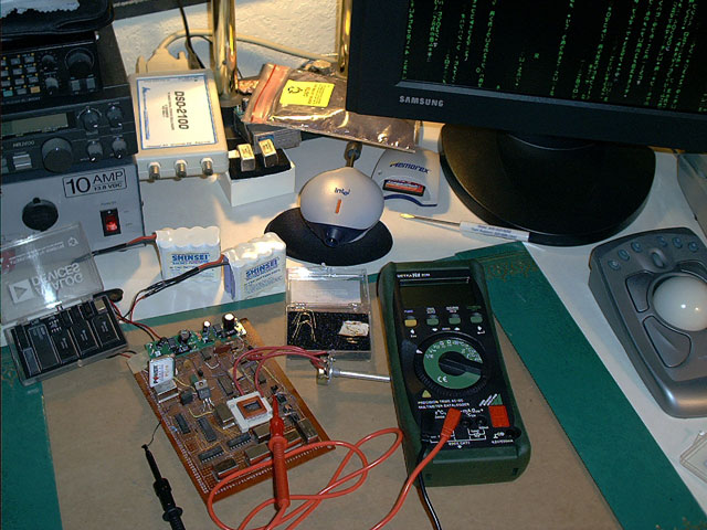 This picture shows some work on a first generation transmission subassembly. The input signal is conditioned in the multiple stage processor boards in green, then injected into the P2 wave DMC section, which comprises the circuitry on the brown board. The DMC shown in this picture is of the dynamic type, which contains the mixer stage as well as the stages required to translate the signal from the complex domain to the imaginary domain. While not shown in this first gen prototype, the entire circuit along with the complex waveform generator (not shown) is completely encased in a shield that makes an effective Faraday cage in order to minimize noise figures.